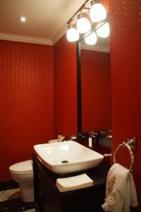 Reconfiguration and Redesignation Powder Room – This powder room was a 15″ deep wet bar when we first entered the apartment. it was transformed into an intoxicating red showpiece.